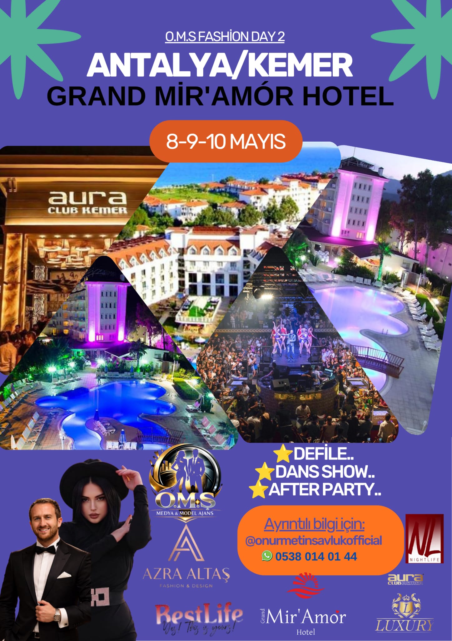 Antalya Kemer’de 8-9-10 Mayıs’ta Gerçekleşecek Olan Bu Büyük Organizasyonda Mir’Amór Hotel Bizlere Ev Sahipliği Yapacak..Bu Organizasyon’un Değerli Yatırımcısı Azra Altaş’ in yani sıra Birbirinden ünlü katılımcılar ve konuklar yer alacak..Defilenin yanisira dans showlar ve Değerli sanatçılar yer alacak..Plaketlerin ve Ödüllerin de Takdim edilecegi bu özel etkinlikte: Organizasyonlar, Defileler ve Güzellik Yarışmaları ile adından sıkça bahsettiren Onur Metin Şavluk Muhteşem bir defile için kollarını sıvadı..Daha Önce Ankara/Crowne Plaza’da O.M.Ş Fashion Day Etkinliği ile 5 Büyük Markayı Bir Araya Getirerek “Kadına Şiddet’e Hayır” Konsepti ile Modaya Katkıda Bulunarak İlgi Çeken Onur Metin Şavluk Bu Defa “Anneler Günü” Konsepti ile Birbirinden Güzel 10 Manken ile Antalya Kemer’de 2.sini Düzenleyecek.Son Gece Aura clubde after parti olacak ve gelecek misafirleri birçok süprizler gözlüyor olacak.