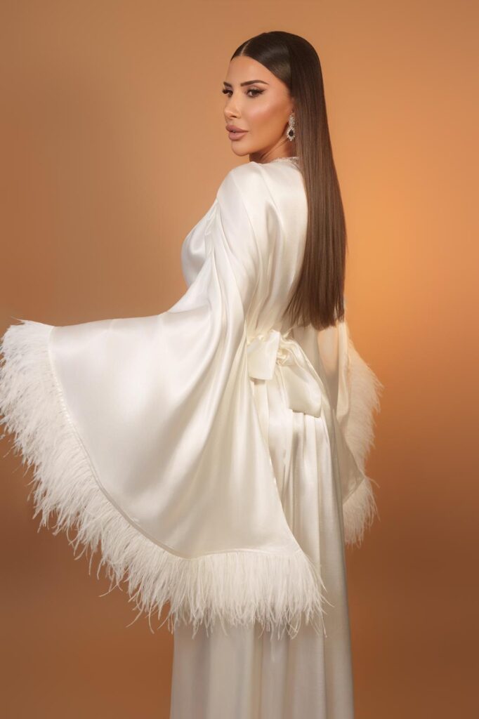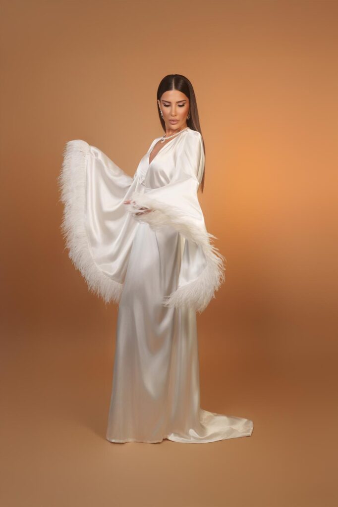 Gelinlerin düğün öncesi şıklığı için sabahlık olarak da tercih edebileceği lüks parçanın modelliğini bizzat kendisi yapan Sayın’ın makyajını Pınar Balota üstlendi. Çekimlerdeki ihtişamlı görüntüsüyle Arap prenseslerine benzetilen başarılı modacı, stil ve zarafetiyle moda dünyasında konuşulmaya devam ediyor.