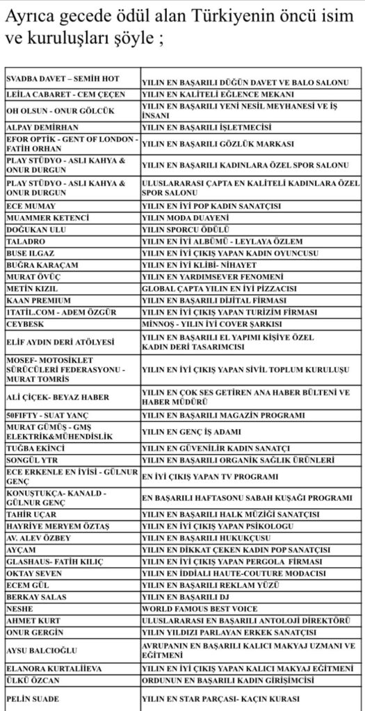 Ayrıca gecede ödül alan Türkiyenin öncü isim ve kuruluşları şöyle ;