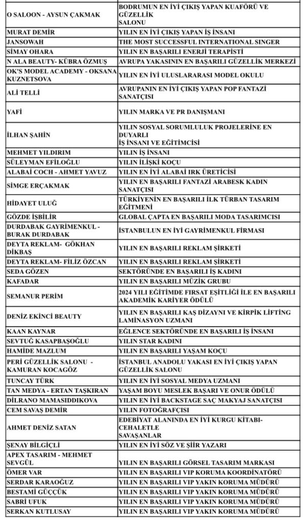 İş insanı ve ünlü organizatör Enes Furkan BİLGİÇLİ imzalı 2024 yılının son ödül töreninde yine ilkler gerçekleşti. SVADBA’nın ana sponsorluğunda , İstanbulun en gözde ve kaliteli mekanlarından LEİLA CABARET İstanbulda düzenlenen gece, sanat , siyaset , medya , magazin ve cemiyet dünyasını bir araya getirdi. Sunuculuğunu ünlü sanatçı ve manken TUĞBA ÖZAY ve ENES FURKAN BİLGİÇLİNİN üstlendiği ve kırmızı halı yerine şiddete farkındalık yaratmak amacıyla mavi halı konsepti uygulandı. Törende yıldızlar geçidi yaşandı.