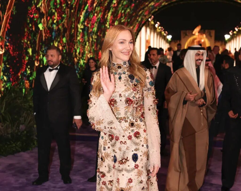 Sıcak bej tonlarındaki uzun kollu tasarım; heykelsi yüksek yakası, yapılandırılmış silueti ve yere kadar uzanan etkileyici formuyla zamansız bir zarafet sunuyor. Gövde ve etek boyunca iki zanaatkâr tarafından 35 günde elde işlenen floral kristal nakışlar, kırmızı, safir mavisi ve antik altın tonlarında mücevher etkisi yaratan sofistike bir ışıltı kazandırıyor.